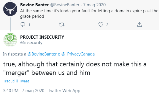 If that wasn't enough, his leet domain insecurity.sh got bought by some Privacy Canada company because Matthew forgot to renew the domain (or was probalby broke and had no money to do that). If you type https://insecurity.sh in your browser you will be redirected to the Privacy Canada website which claims that they have merged with Project Insecurity, while in reality they just stole the domain. At this point MLT was mad and started some beef with the Privacy Canada guy but a twitter user pointed out that it was Matthew's fault for not having renew the domain.